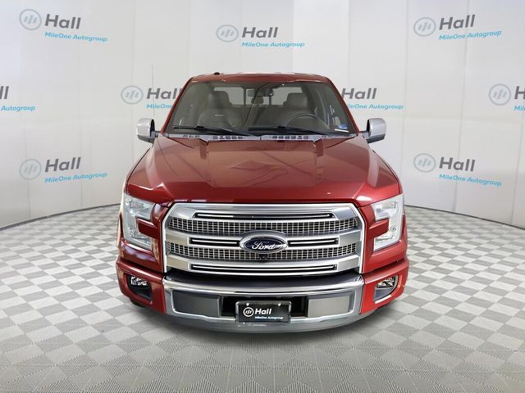 Clean CARFAX. Ruby Red Metallic 2015 Ford F-150 Platinum RWD 6-Speed Automatic Electronic 3.5L V6 We are currently offering Vehicle Purchase Home Delivery by appointment. Please contact for details., 10 Speakers, 20" Polished Aluminum Wheels, 4-Wheel Disc Brakes, ABS brakes, Adjustable pedals, Air Conditioning, All-Weather Rubber Floor Mats, Alloy wheels, AM/FM radio: SiriusXM, Auto High-beam Headlights, Auto tilt-away steering wheel, Auto-dimming door mirrors, Auto-dimming Rear-View mirror, Automatic temperature control, Auxiliary Transmission Oil Cooler, Black Unique Multi-Contour Leather Bucket Seats, Brake assist, Bumpers: chrome, CD player, Class IV Trailer Hitch Receiver, Compass, Delay-off headlights, Driver door bin, Driver vanity mirror, Drop-In Plastic Bedliner (Pre-Installed), Dual front impact airbags, Dual front side impact airbags, Electronic Stability Control, Equipment Group 701A Luxury, Extended Range 36 Gallon Fuel Tank, Exterior Parking Camera Rear, Front anti-roll bar, Front Bucket Seats, Front Center Armrest, Front dual zone A/C, Front fog lights, Front License Plate Bracket, Front reading lights, Front wheel independent suspension, Fully automatic headlights, Garage door transmitter, Genuine wood door panel insert, Heated door mirrors, Heated front seats, Heated rear seats, Heated steering wheel, Illuminated entry, Integrated Trailer Brake Controller, Low tire pressure warning, Memory seat, Navigation System, Occupant sensing airbag, Outside temperature display, Overhead airbag, Overhead console, Panic alarm, Passenger door bin, Passenger vanity mirror, Pedal memory, Power door mirrors, Power driver seat, Power passenger seat, Power steering, Power windows, Premium audio system: Sony, Radio data system, Radio: Sony Single CD w/HD & SiriusXM Satellite, Rain sensing wipers, Rear Parking Sensors, Rear reading lights, Rear seat center armrest, Rear step bumper, Rear window defroster, Remote keyless entry, Security system, Speed control, Speed-sensing steering, Split folding rear seat, Steering wheel memory, Steering wheel mounted audio controls, SYNC with MyFord Touch, Tachometer, Telescoping steering wheel, Tilt steering wheel, Traction control, Trailer Tow Package, Trip computer, Turn signal indicator mirrors, Upgraded Front Stabilizer Bar, Variably intermittent wipers, Ventilated front seats, Voice-Activated Navigation, Voltmeter.