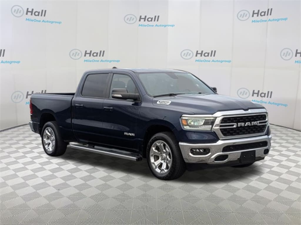 Patriot Blue Pearlcoat 2022 Ram 1500 Big Horn/Lone Star RWD 8-Speed Automatic HEMI 5.7L V8 Multi Displacement VVT We are currently offering Vehicle Purchase Home Delivery by appointment. Please contact for details., 115V Auxiliary Power Outlet, 3 Rear Seat Head Restraints, 3.21 Rear Axle Ratio, 4 Way Front Headrests, 4-Wheel Disc Brakes, 400W Inverter, 48V Belt Starter Generator, 6 Speakers, ABS brakes, Air Conditioning, Alloy wheels, AM/FM radio, Anti-Spin Differential Rear Axle, Big Horn Level 2 Equipment Group, Black Exterior Mirrors, Brake assist, Bumpers: chrome, Cloth Bench Seat, Cluster 7.0" TFT Color Display, Compass, Connected Services Delete Credit, Convex Wide-Angle Mirror Insert, Delay-off headlights, Driver door bin, Dual front impact airbags, Dual front side impact airbags, Electronic Stability Control, Emergency communication system: SiriusXM Guardian, Front anti-roll bar, Front Center Armrest w/Storage, Front fog lights, Front LED Fog Lamps, Front License Plate Bracket, Front reading lights, Front Seat Back Map Pockets, Front wheel independent suspension, Fully automatic headlights, Global Telematics Box Module (TBM), GPS Antenna Input, Heated door mirrors, Illuminated entry, Integrated Voice Command w/Bluetooth, Leather steering wheel, LED Reflector Headlamps, LED Taillamps, Low tire pressure warning, MOPAR Front & Rear Rubber Floor Mats, Occupant sensing airbag, Outside temperature display, Overhead airbag, Overhead console, Panic alarm, ParkSense Front/Rear Park Assist w/Stop, ParkView Rear Back-Up Camera, Passenger door bin, Passenger vanity mirror, Power door mirrors, Power steering, Power windows, Premium Lighting Group, Quick Order Package 25Z Big Horn, Radio data system, Radio: Uconnect 3 w/5" Display, Radio: Uconnect 5 W w/8.4" Display, Rear 60/40 Folding Seat, Rear anti-roll bar, Rear seat center armrest, Rear step bumper, Rear Wheelhouse Liners, Remote keyless entry, Remote Start System, Speed control, Split folding rear seat, Steering wheel mounted audio controls, Tachometer, Telescoping steering wheel, Tilt steering wheel, Traction control, Trip computer, Variably intermittent wipers, Voltmeter, Wheels: 18" x 8" Cast-Aluminum Painted, Wheels: 20" x 9" Aluminum Chrome Clad (WRK).